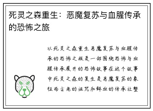 《以死灵之森重生:恶魔复苏与血腥传承的恐怖之旅》是一部围绕恐怖与血腥传承展开的恐怖故事。在这个故事中,死灵之森的复生是恶魔复苏的象征,而古老的诅咒和鲜血的传承让整个故事充满了神秘与恐惧。本文将从四个方面详细阐述这一恐怖之旅的各个元素:死灵之森的复生、恶魔的复苏、血腥传承的背后故事,以及主角在这场恐怖之旅中的成长与挑战。通过这四个方面的深入分析,读者将对整部作品的恐怖氛围、剧情发展以及人物命运有更为清晰的理解。